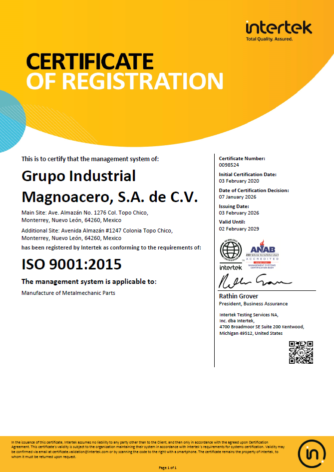 Nuestra manufactura de acero se rige por estrictos estándares de calidad, respaldados por un Sistema de Gestión certificado bajo ISO 9001:2015 e IATF, lo que nos permite garantizar procesos confiables, repetibles y orientados a la mejora continua.